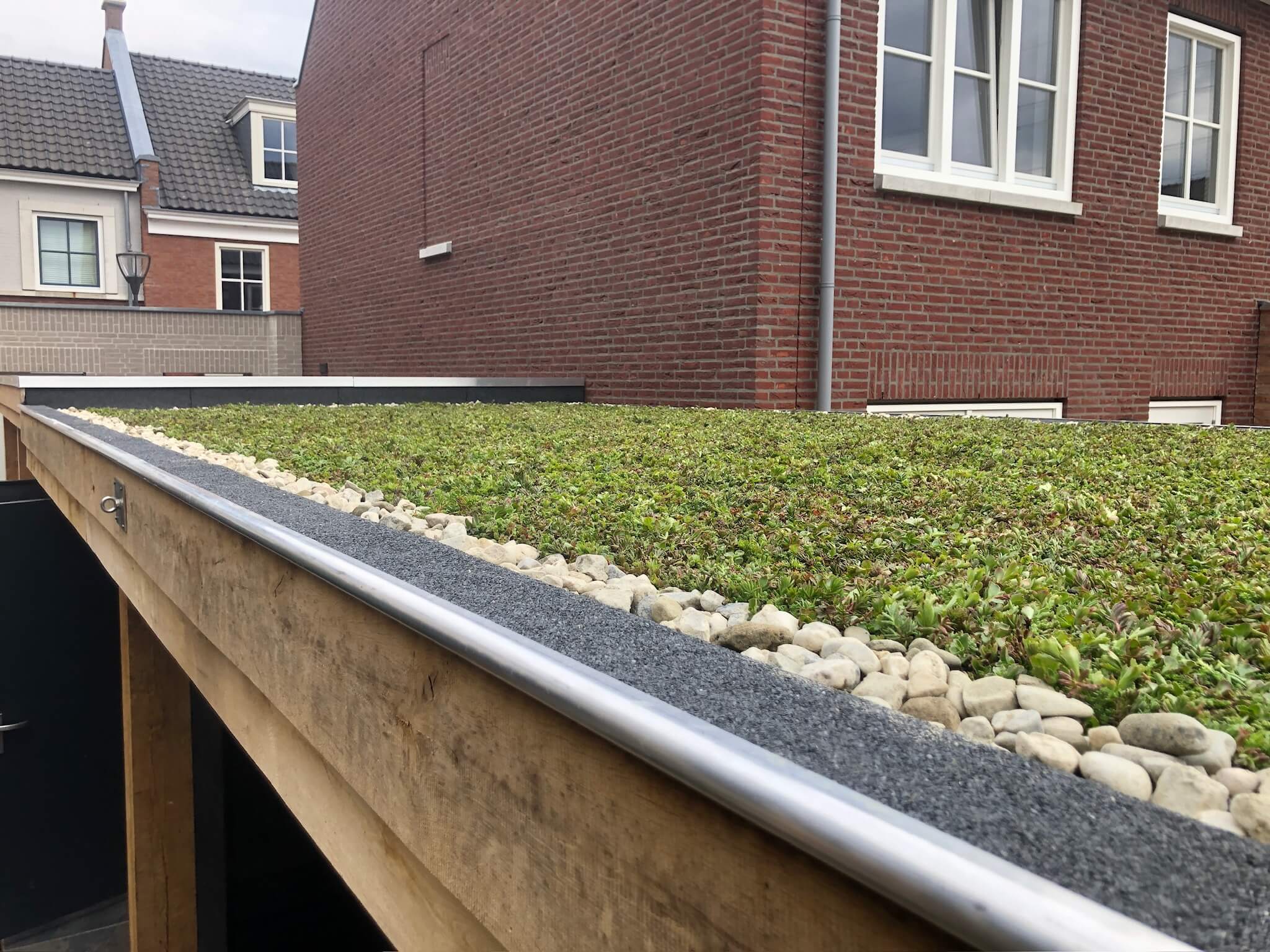 Strooi ca. 10 cm brede stroken rondom dakranden en afvoeren voor een veilige, onderhoudsarme afwerking van je sedumdak.